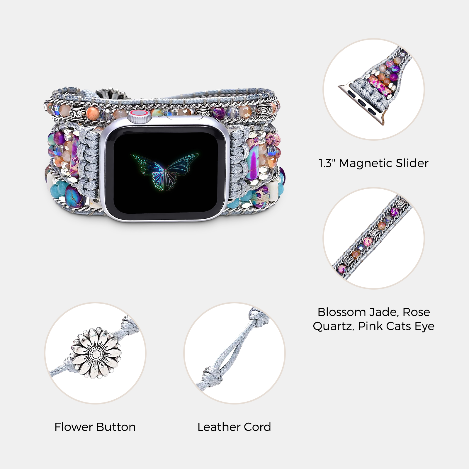 用我们的 Jasper 波西米亚风串珠表带提升您的 Apple Watch 格调。这款手工打造的配饰将天然宝石与波西米亚风情完美融合。 这款独特的手镯式表带旨在为任何装扮增添魅力和优雅,无论您是在家、在办公室还是在度假,都能让您成为众人瞩目的焦点。