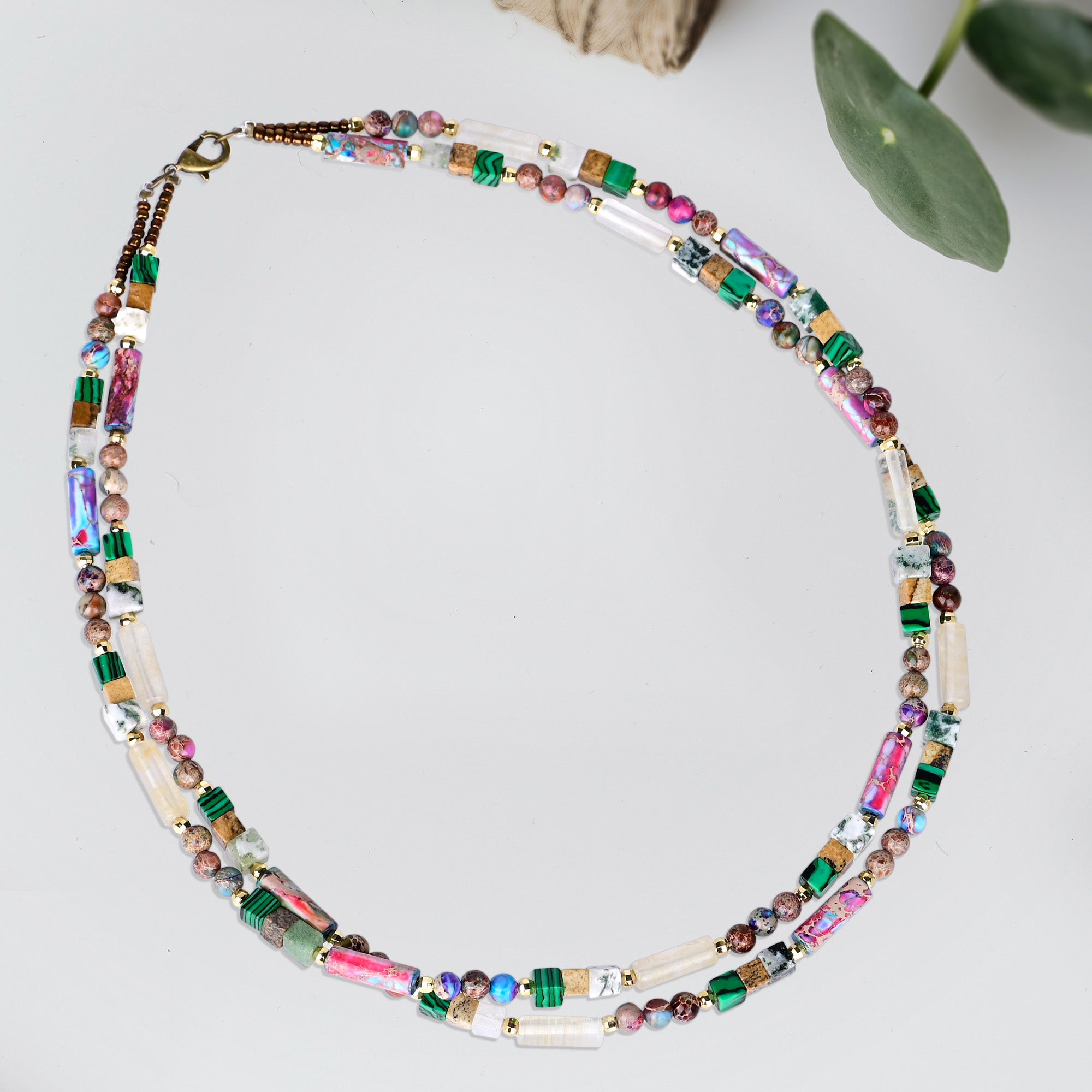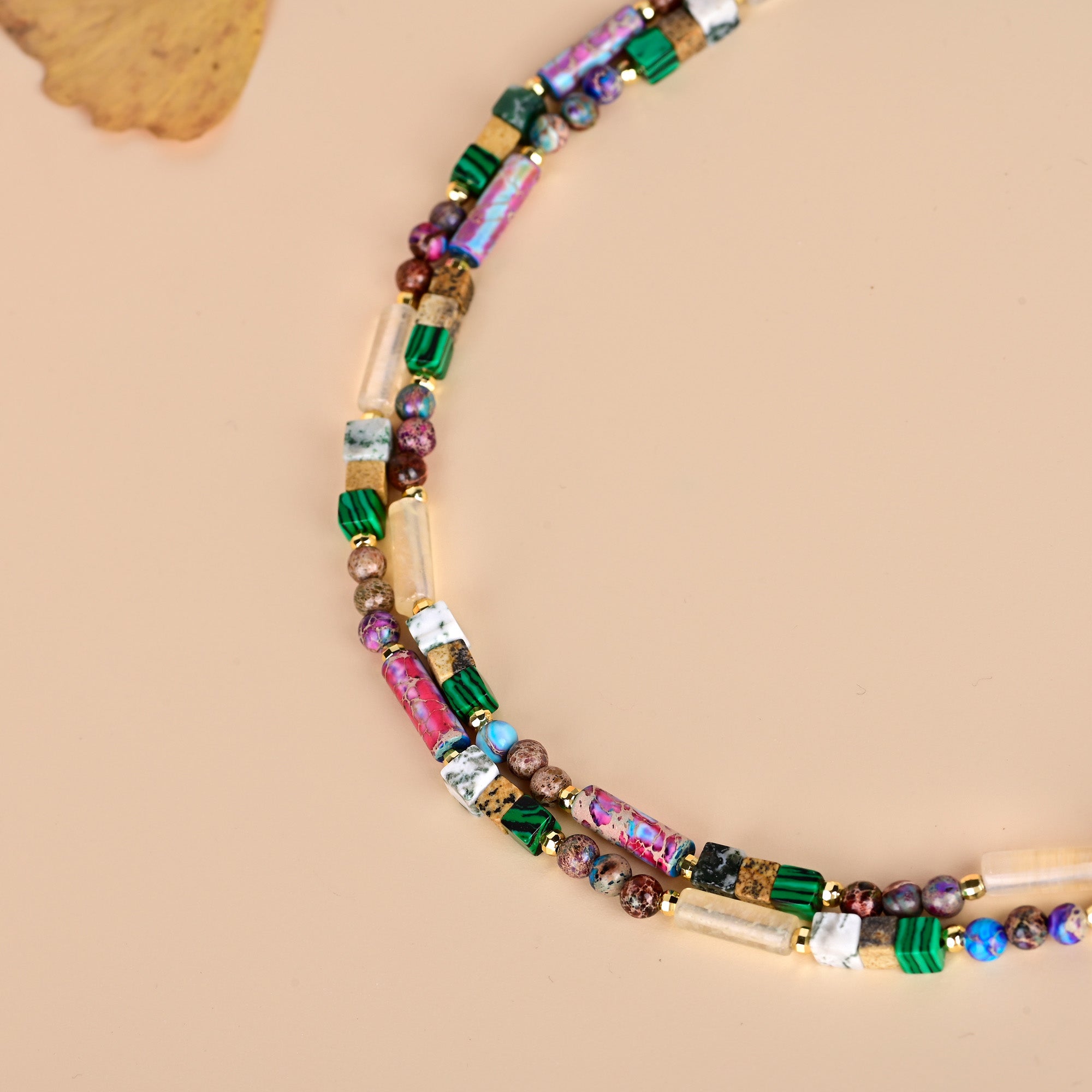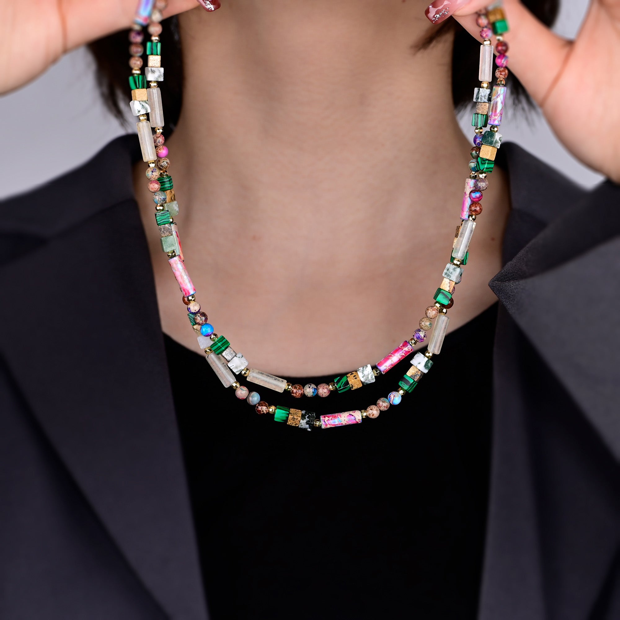 Colorful Glass Natural Stone Spliced Beaded Necklace, Energy Gemstone,