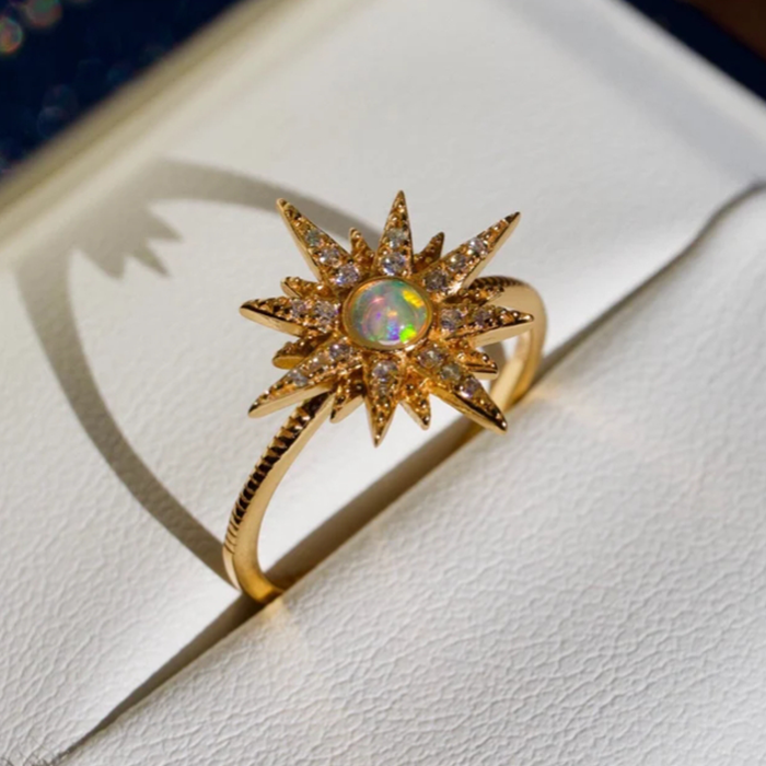 Natural rainbow opal is stunning and emotional. The sun or stars appear to be shining. Opal and zircones of grade 5A gleam. It’s the most amazing ring ever!
